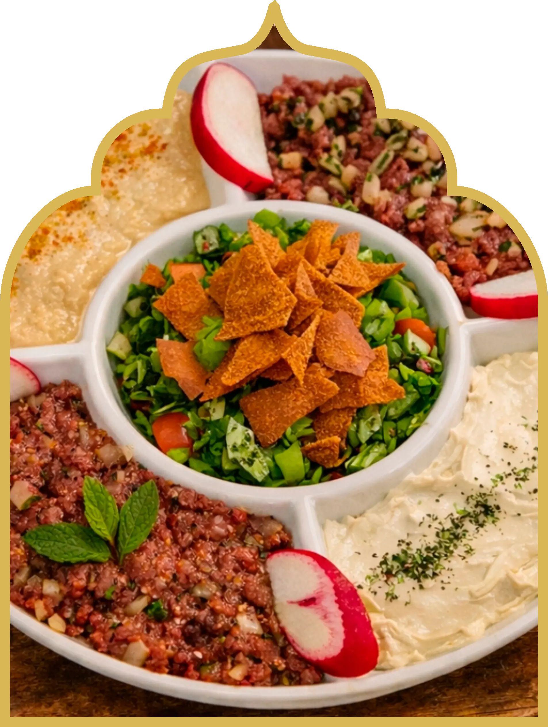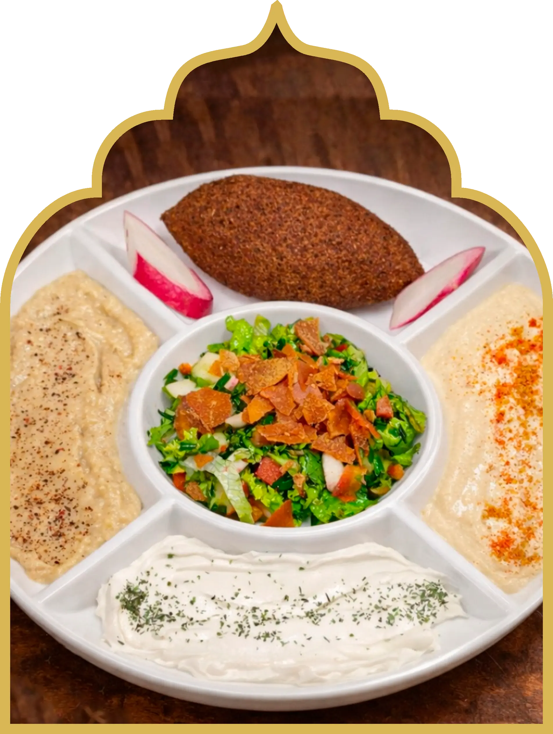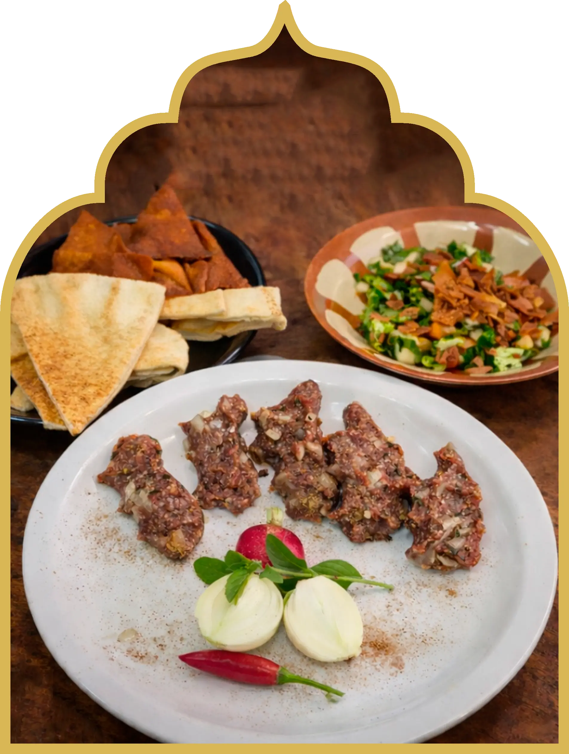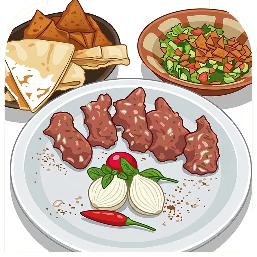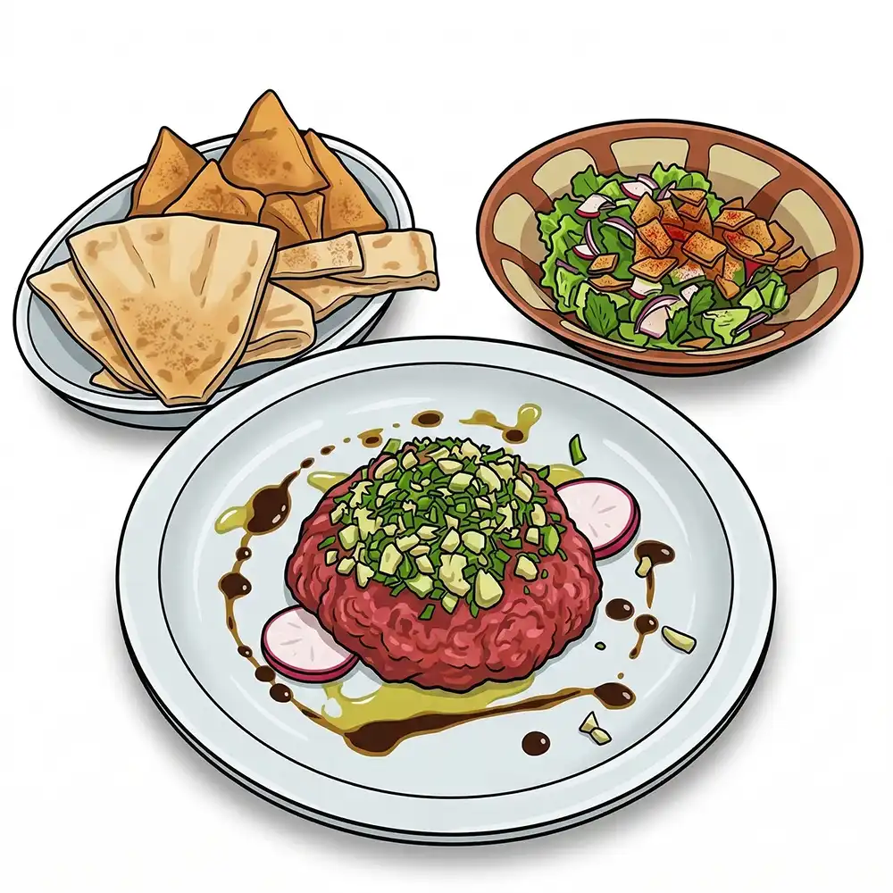 Uma porção de 200g de carne crua de alta qualidade. Temperado com especiaria que realçam seu sabor autêntico. Acompanha Fatouch, uma salada árabe feita com hortaliças frescas, pão árabe macio e pão árabe frito.