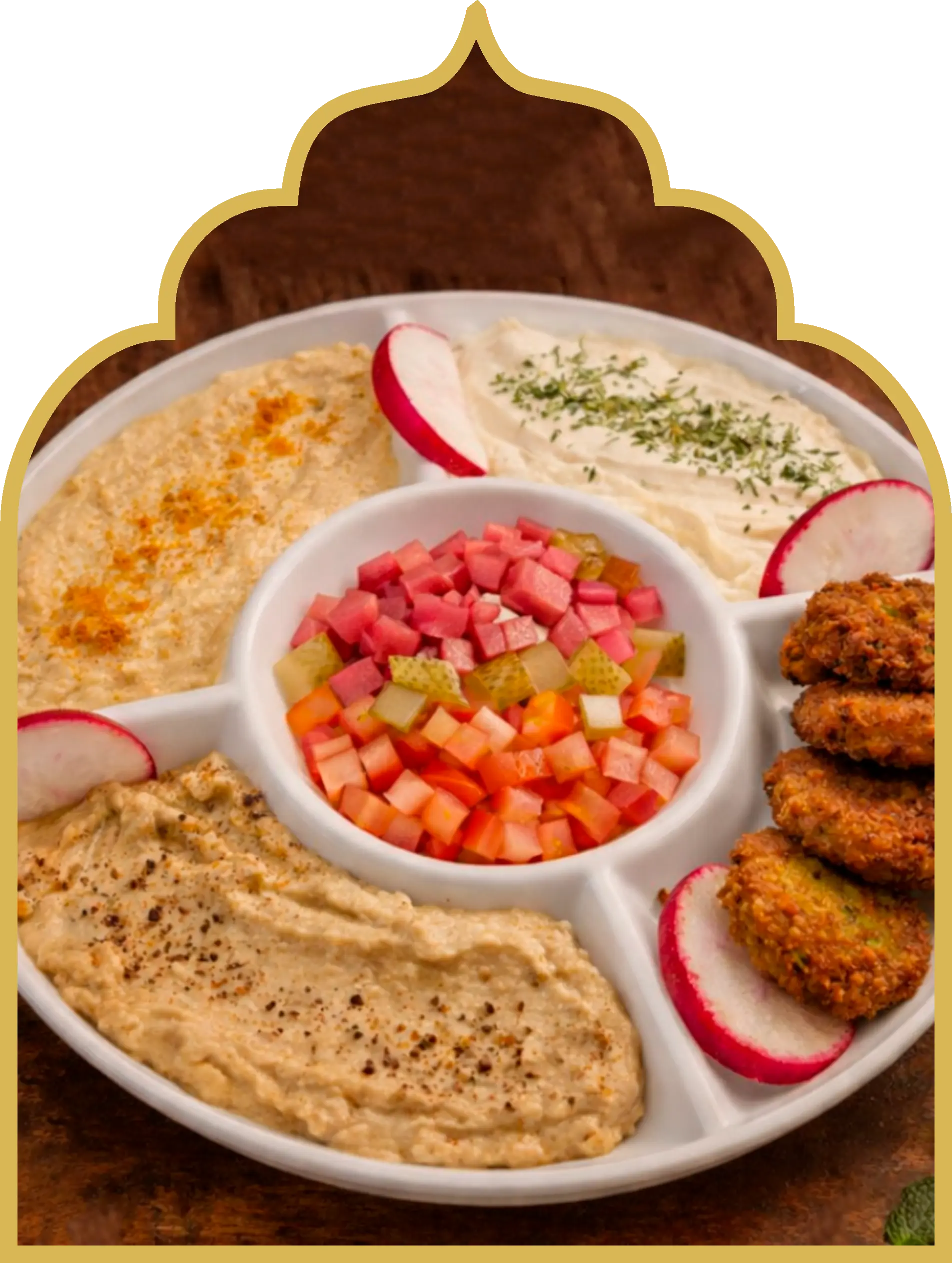 Kibe frito crocante por fora e suculento por dentro, com hommus, babaganoush, coalhada seca e Fatouch. Servido com pão árabe.
