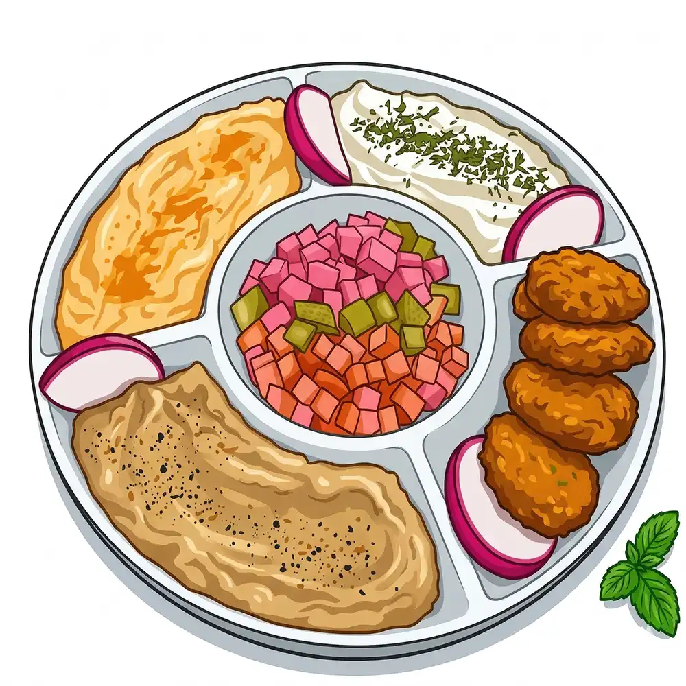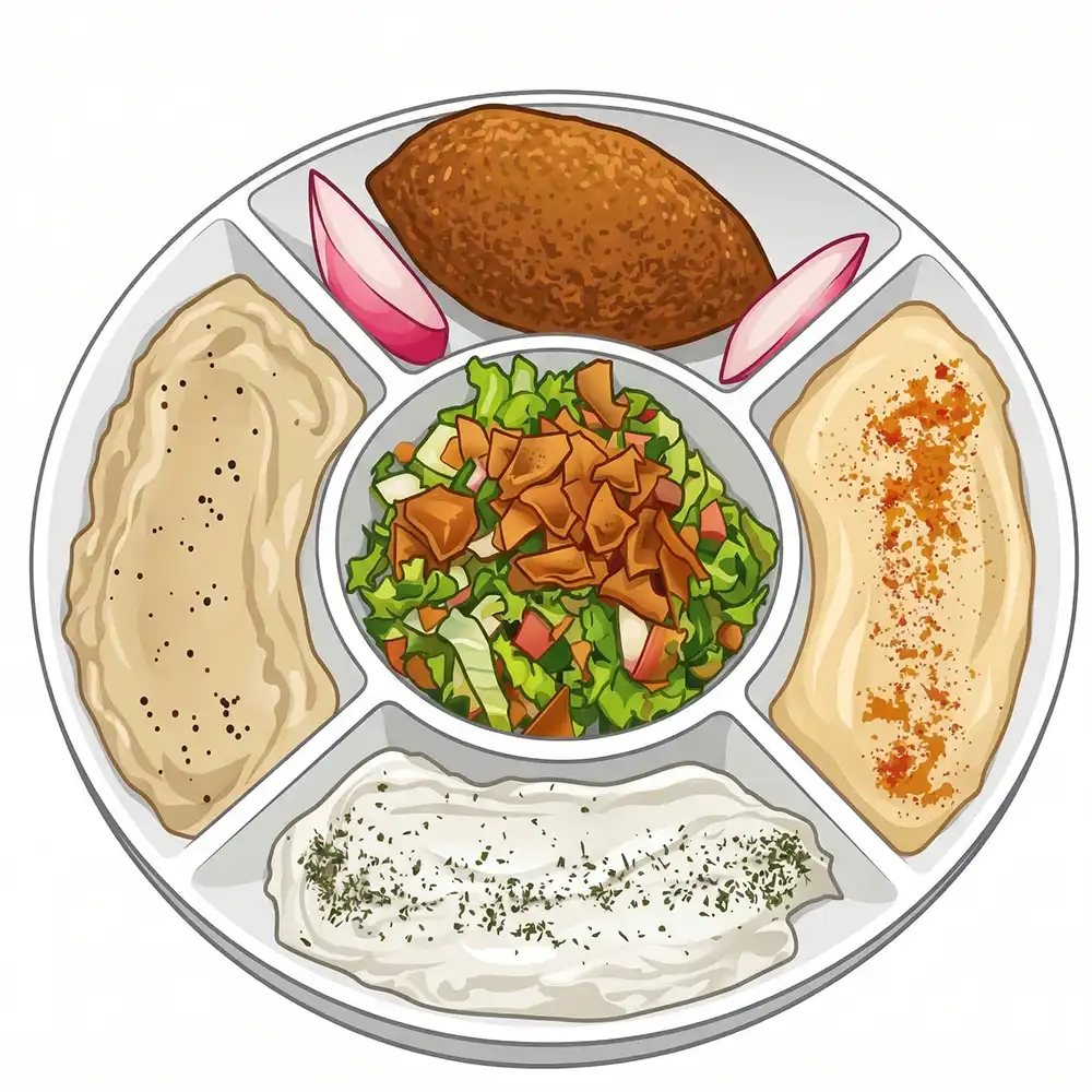 5 falafels artesanais com hommus, babaganoush, coalhada seca, pickles e taratur. Acompanha pão árabe macio e crocante. Equilíbrio perfeito entre cremosidade e textura.