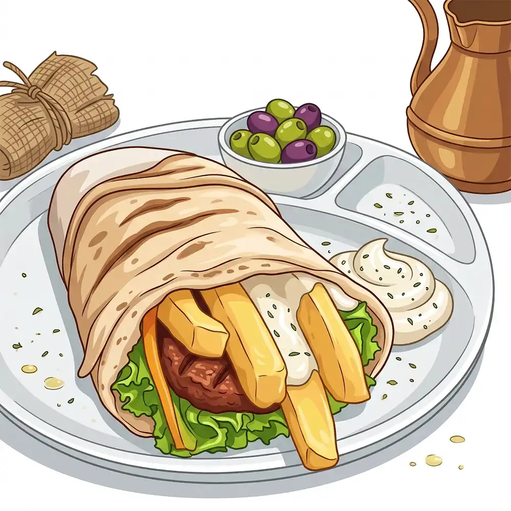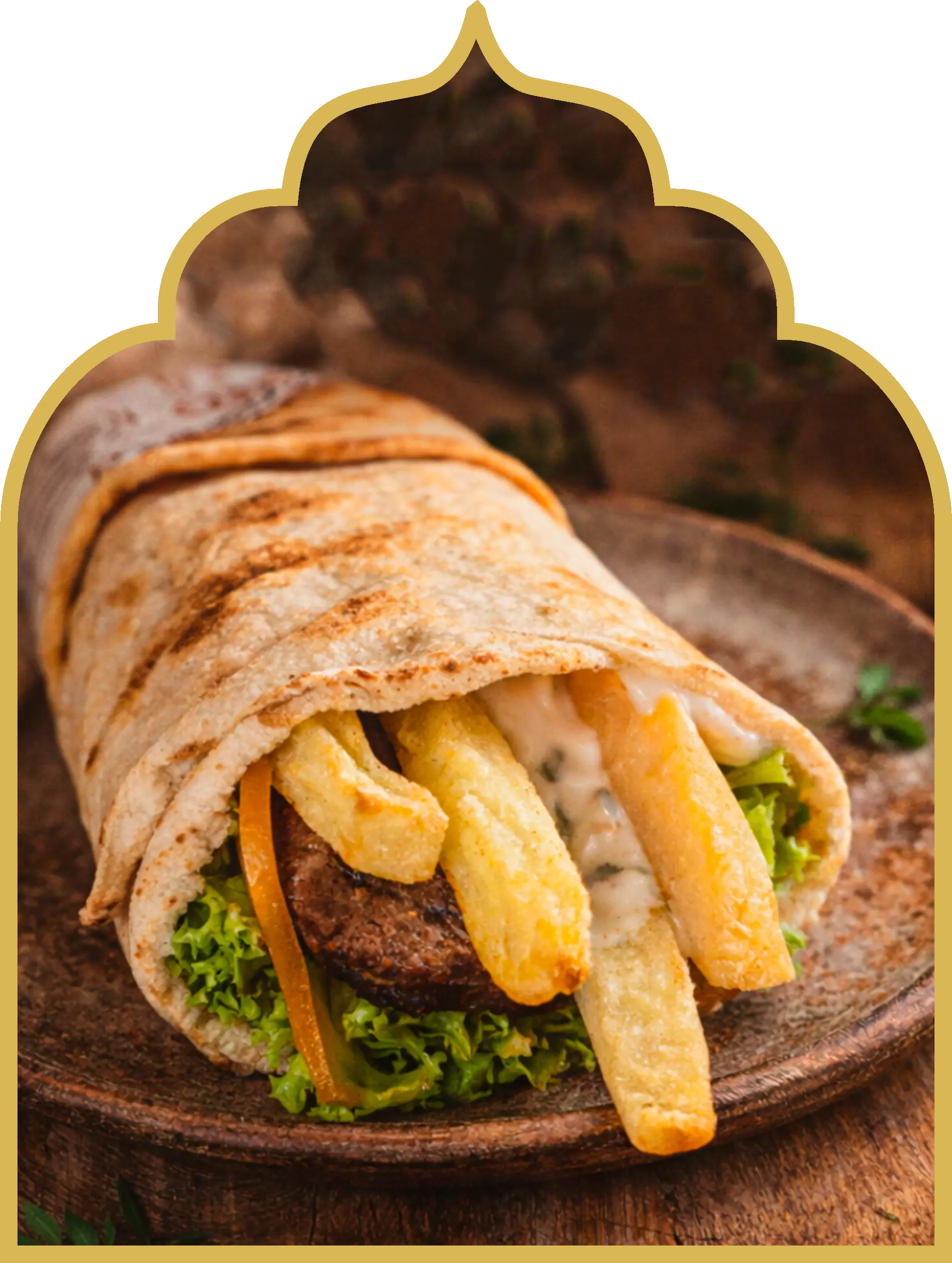 Pão árabe gourmet recheado com kafta artesanal suculenta, salada fresca, batatas crocantes e molho de tahine. Sabor intenso em cada mordida.